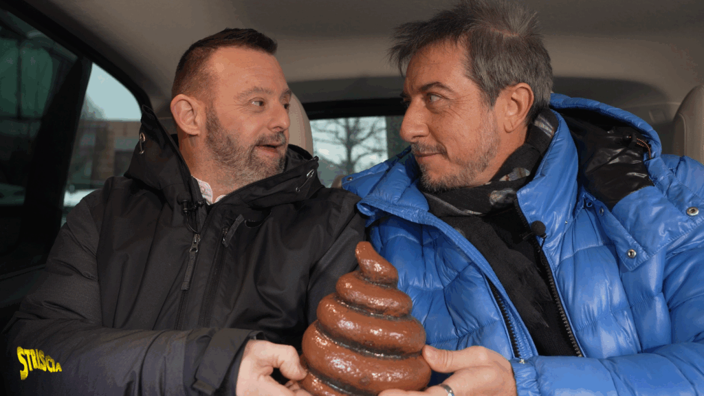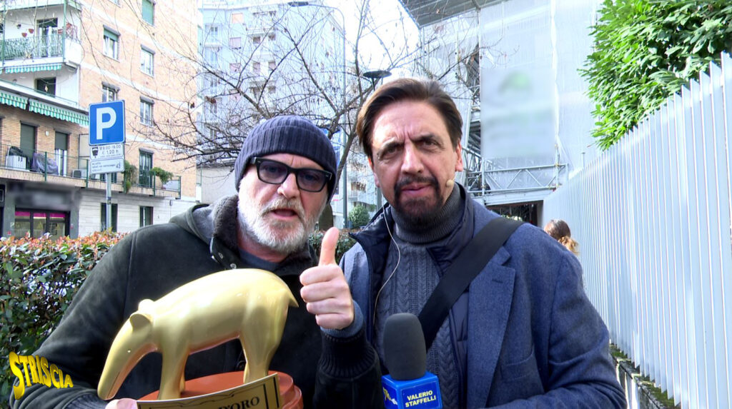 Valerio Staffelli consegna l’ultimo tapiro d’oro di questa edizione di Striscia la Notizia ad Andrea Pucci.